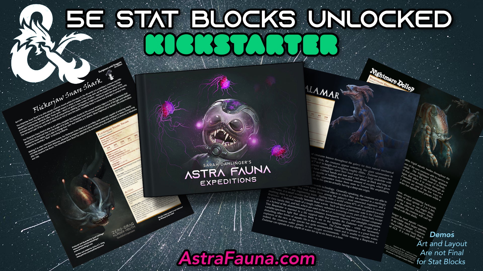Bonus Content Added! All copies will come with stat blocks AND 5E stat blocks so you can use the Astra Fauna creatures and characters in your own homebrew role playing games!