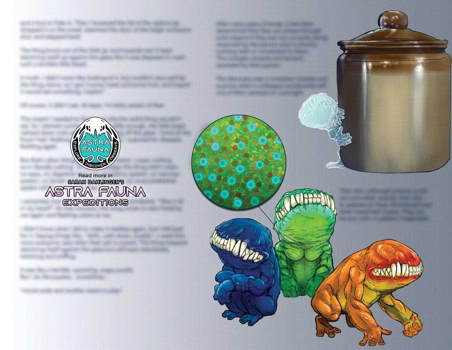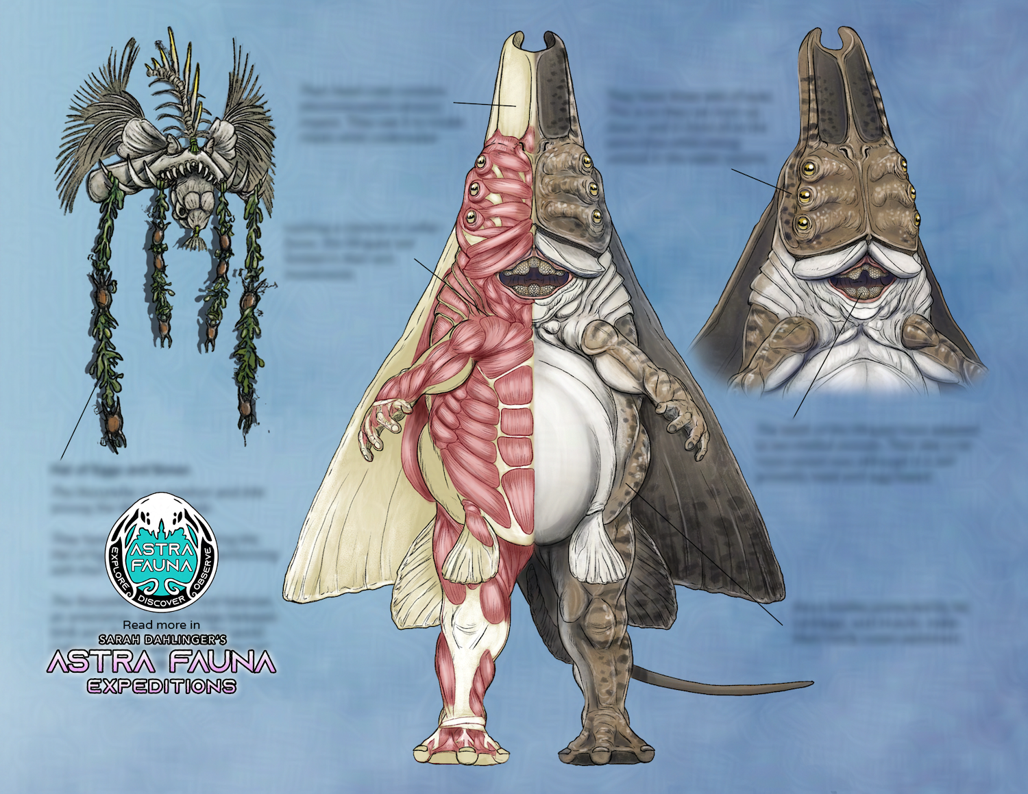 Simply put—Astra Fauna is one of the more unique and creative publications that I’ve ever come across. The format is clever and draws you right in. The characters that we’re introduced to are cool as hell, and their observations are insightful and fun! But it’s Sarah’s creations, the fauna, that really shine! What a pleasure it is to find such a detailed, interesting collection of creatures to enjoy! This volume radiates love of creation, every page oozing with the heart that its artist poured into it. Without giving too much away, let me simply say that Astra Fauna is a spectacular example of what art should be, can be, when nurtured with the hard work and inspiration of the artist. Whether you’re a fan of science fiction, creature creation, beautiful renders of curious life forms or simply enjoy a colorful and amazing collection of splendid art, this wonderful presentation of Sarah Dahlinger’s talents is an amazing journey of discovery that I’m grateful to have been invited to share. Well done!